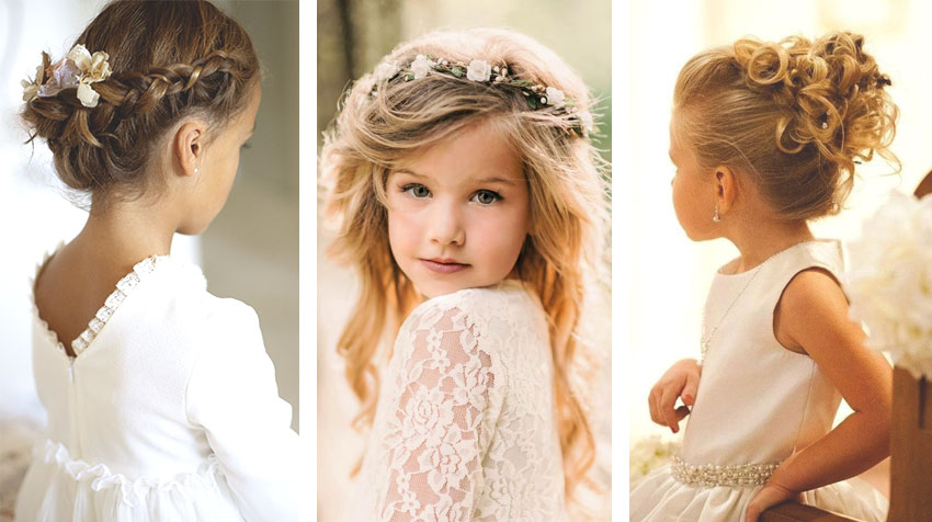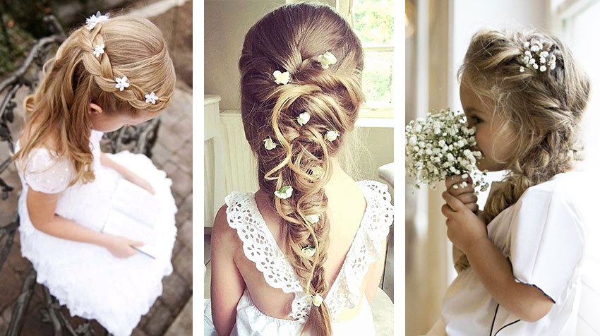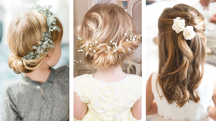 Dağınık topuzlar, uzun saçlara maşalar, çiçeklerle donatılmış örgüler düğün için çocuk saç modellerinin en sevilenlerinden.