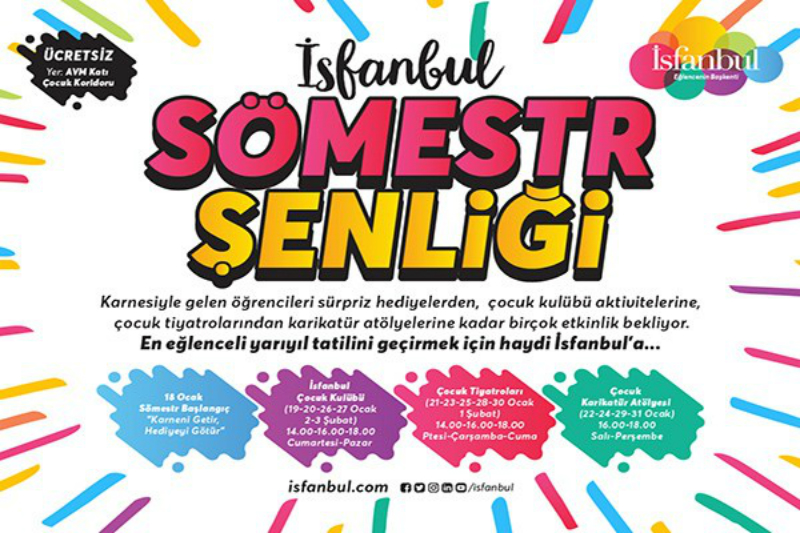 İstanbul’un en büyük eğlencenin merkezi İsfanbul; okullarda sömestr tatili başlar başlamaz, çocuğunun doyasıya eğleneceği bir etkinliğe ev sahipliği yapıyor. Karnesiyle birlikte gelen tüm öğrencilere sürpriz hediyeler, tiyatrolar, atölyeler sunan Sömestr Şenliği’nin artılarından biri de ücretsiz çocuk etkinliklerinden biri olması!