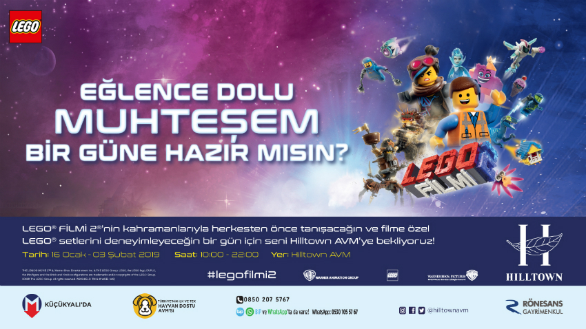 Çocuk-büyük herkesin sevdiği Lego, 15 tatil boyunca Hilltown AVM’de sevenleriyle bir araya gelecek. Çocuğun bu etkinlikte Lego Filmi 2’nin kahramanlarıyla tanışacak ve daha önce hiç görmediği Lego setlerini deneyecek. Ayrıca değişik çocuk atölyeleri ve sürpriz gösteriler de bu etkinlikte yer alacak!
