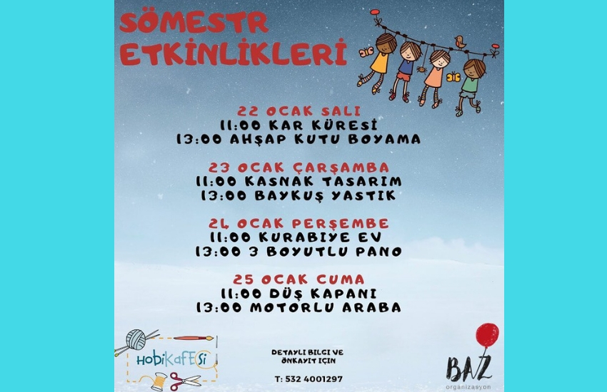 Hobi Kafesi, çocuklar üreterek eğlensin diye yarıyıl tatili için birbirinden farklı atölyeler düzenliyor. “Sömestr tatilinde Ankara’da nereye gidilir, çocuğumu nereye götürmeliyim? diye merak eden anneler için güzel bir alternatif olan bu atölyeler içinde kar küresi tasarımı, ahşap kutu boyama, kurabiyeden ev yapma, düş kapanı tasarımı gibi etkinlikler var.