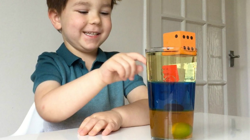Bir şişenin yarısına mavi boyalı su koy, geri kalanını mutfakta kullandığın sıvı yağ ile doldur. Kapağını sıkıca kapatıp, çocuğunun bununla oynamasına izin ver. Böylece su ve yağın birbirine karışmadığını keşfedecek.