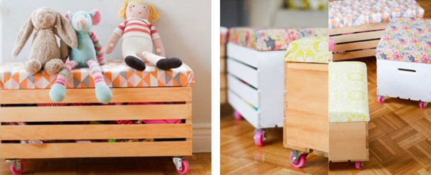 Al sana hem dekoratif hem de fonksiyonel bir fikir. İçine oyuncakları yerleştirebileceğin oyuncak sandığının üzerine bir oturma alanı yapıyorsun. Altına tekerlek koyuyorsun ve tekerlekli puf oluveriyor. Yapımı çok zor görünmüyor, maharetli ellerine güvenmen yeter.