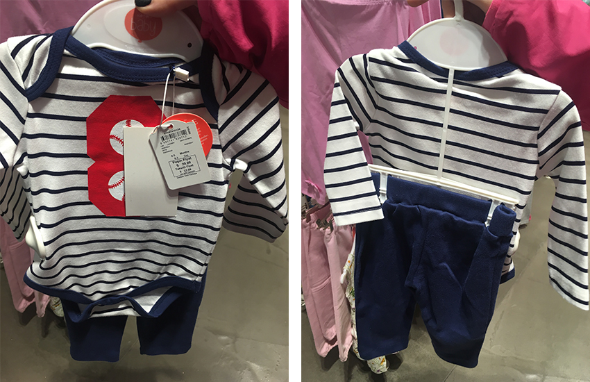 Evet, AVM gezimizde bebek takımlarının sonuna geldik. Koton bebek giyimde pek takım modeliyle karşılaşmadık. Gözümüze çarpan tek takımı da seninle paylaşalım. Takım, golf toplarıyla süslenmiş çizgili çıtçıtlı zıbın ve altındaki lacivert tayttan oluşuyor.