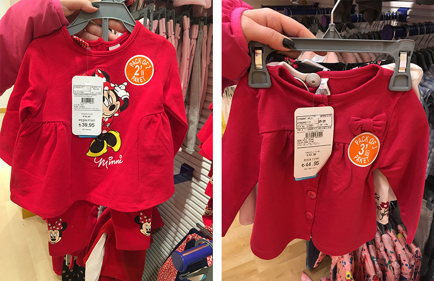 | Lc Waikiki 2’li kız bebek takımı | Minnie Mouse desenli bu takım, çıtçıtlı bir üst ve alt kısmında yine şirin Minnie’nin yer aldığı tayttan oluşuyor. | 39,95 TL |