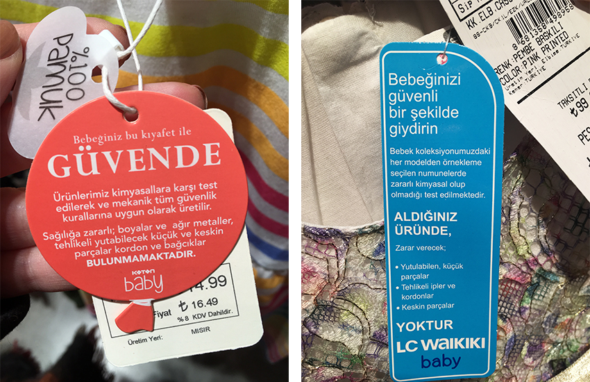 Kumaş kalitesi ve özellikleri, bebek alışverişindeki en hassas noktalardan biri. Markalar bu özel ilgi nedeniyle giysilerin üzerine kumaş bilgilendirmesi için etiket basmaya başlamışlar. Mesela Koton bebek giyimdeki kıyafetler %100 pamuktan üretiliyormuş. Ürünler kimyasallara karşı çeşitli testlerden geçirilerek satışa sunuluyormuş. Aynı şekilde LC Waikiki bebek giyimde de kıyafetlerin üzerinde bilgilendirme etiketleri var.