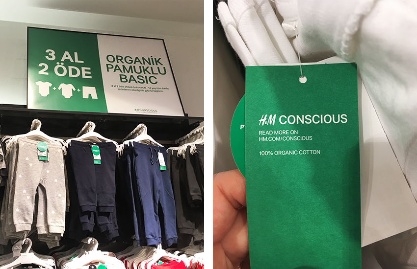 H&M bebek giyimde bu konuya ayrı bir hassasiyet gösterilmiş durumda. H&M mağazalarında organik pamuklu bebek kıyafetleri için özel bir reyon var. Bu reyonda tüm kıyafetlerde şu anda 3 al 2 öde kampanyası var, fırsatı kaçırma.