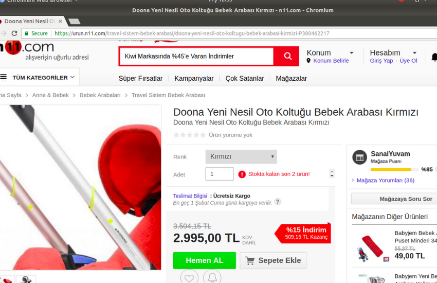 - Ürün tükenmek üzereymiş, bu ibare kırmızı ile belirtilmiş. Ürün detayına baktığımızda “stokta kalan son 2 ürün” ibaresini gördük.