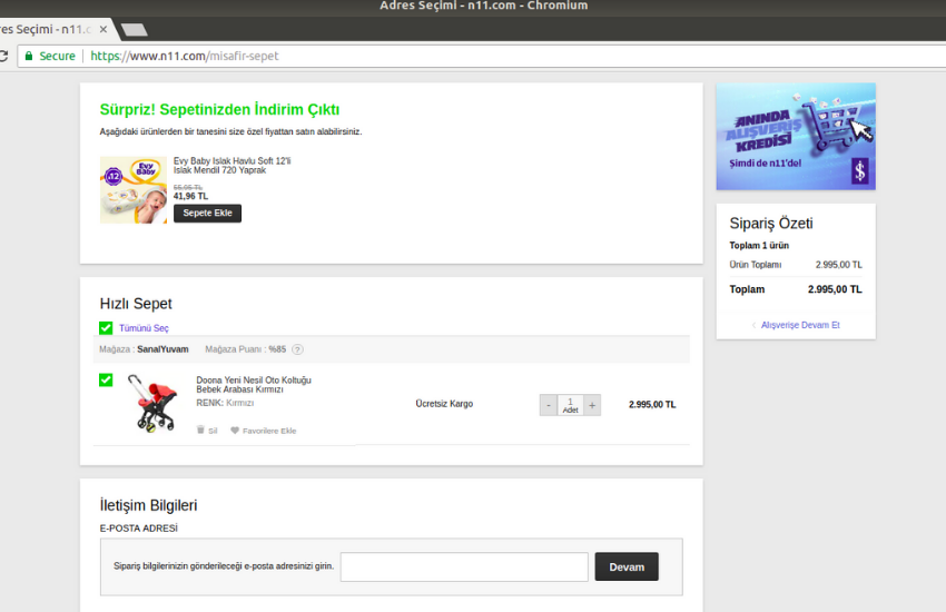 Sepete attığımız ürünü satın almak için üyelik şart değil. Yani üye olmadan devam ettik ancak e-posta adresini vermemiz gerekti.