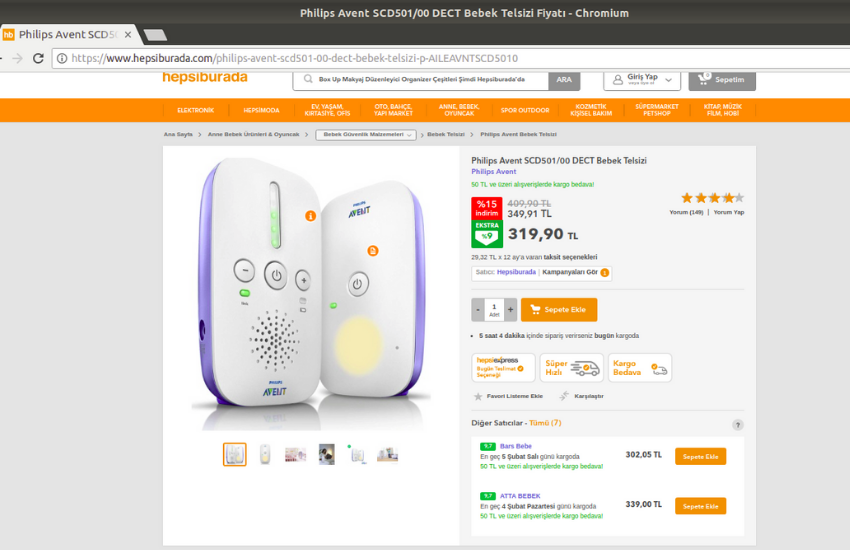 - Satıcısı Hepsiburada olan telsiz sayfasından alışverişi yaptık. Aslında diğer satıcı olan Bars Bebe'de 302,05 TL fiyat vardı ama hızlı teslimat seçeneği "Hepsiburada" satıcısında olduğu için onu seçtik.