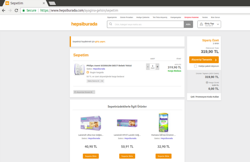 9 e-ticaret sitesinde aradık, 6’sında bulabildik. Bu sitelerde ürünün fiyatı 319,90 ile 409 TL arasında değişiyordu. Hepsiburada, 319,90 TL‘lik fiyatı ile bu ürün için en uygun alışveriş sitesiydi. Bu yüzden alışverişimize Hepsiburada'da devam ettik.