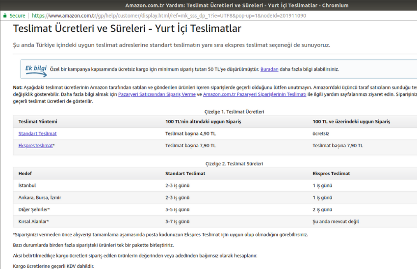 Express kargo seçeneğinden yararlanıldığında 14:00’e kadar verdiğimiz siparişler gün içerisinde kapımıza gelebiliyor. Bu seçenek şu an için sadece İstanbul’da var. Eğer bunu kullansaydık aynı gün teslimat için 12,90, ertesi gün gönderim için de 10,90 TL ödememiz gerekecekti.