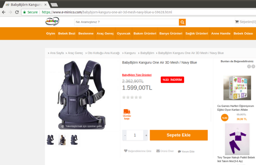- Fiyatı 2362.90 TL olan ürünün, % 33’lük indirimle 1599 TL’ye düştüğünü gördük.