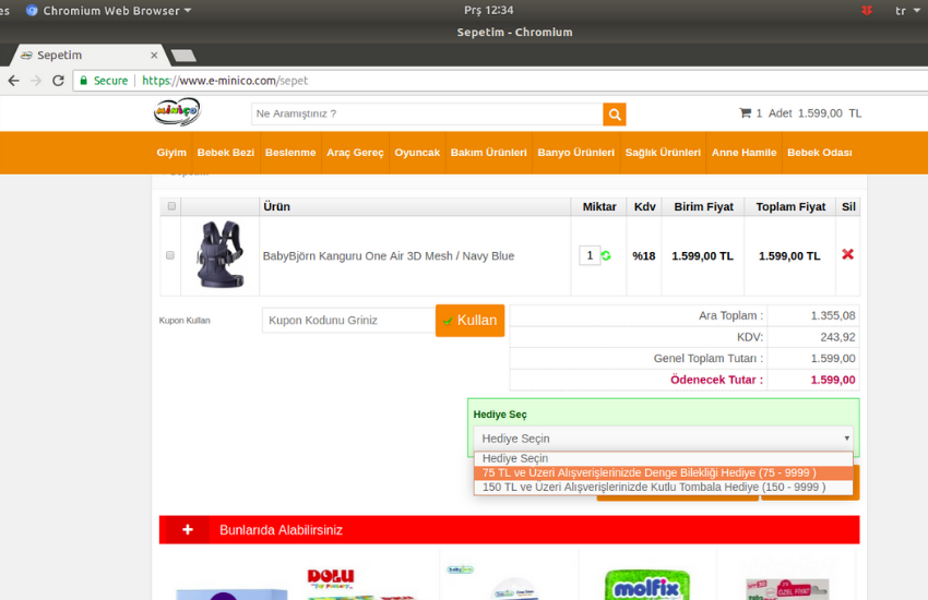 - Sepete attığımız ürünü üye olmadan da satın alabildik. Satın alma aşamasında ise bir sürprizle karşılaştık. Miniço bize hediye verdi! Hatta hediyeyi seçmediğimiz için satın almaya devam edemedik. Hediye seçme menüsü bize iki alternatif sunuyordu. 75 TL+ alışverişimize denge bilekliği ya da 150 TL+ alışverişimize kutulu tombala hediye ediyordu. Denge bilekliğini seçerek yolumuza devam ettik.