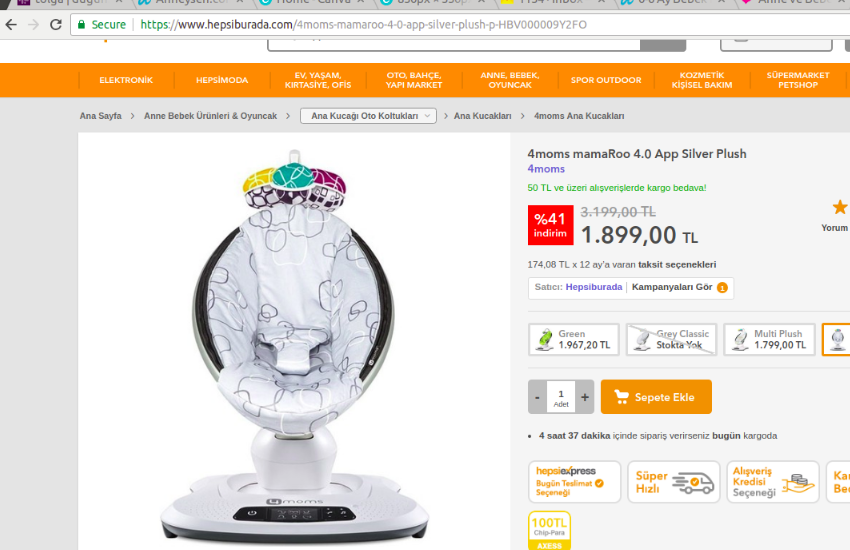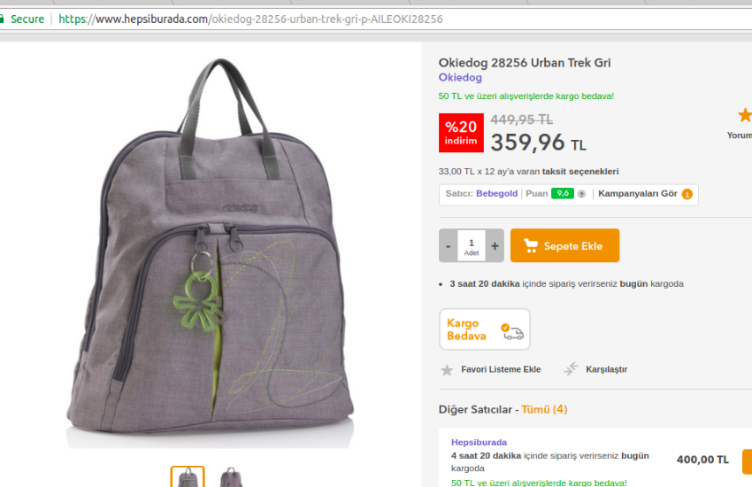 Araştırdığımız 9 e-ticaret sitesinin 5’inde bu bebek bakım çantasını bulabildik. Satış fiyatları 359,95 ila 570 TL idi. Hepsiburada 359,95 TL fiyatı ile ürünün en ucuz halini bulduğumuz site olduğu için oradan satın aldık.
