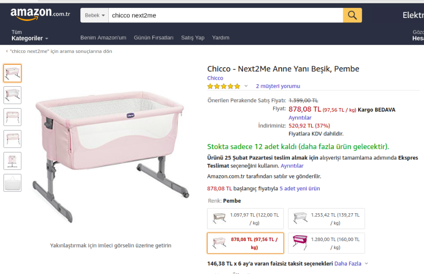 Yaygın bir anne bebek ürünleri markası olan Chicco’nun bu beşiğini kolayca bulabilirsin. Göz gezdirdiğimiz 9 e-ticaret sitesinin 8’inde ürün vardı. Satış fiyatları 878,01 ila 1399 TL idi. Ürünün bulunduğu en ucuz fiyatlı site Amazon (ürün sağlayıcısı Chicco) idi.