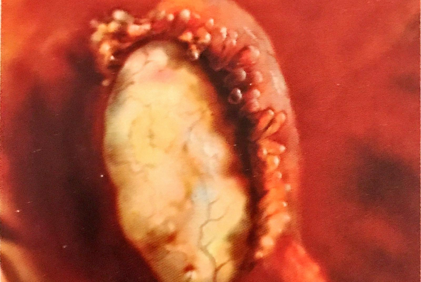 Yukarıdaki görselde yumurtalık fallop tüpünün sonunda görülebilir. Adet döngüsünün bu zamanında, yumurtalık yüzeyindeki bir folikül, fimbria adı verilen parmak benzeri çıkıntılar tarafından açıkça görülebilen bir tüpe süpürülen bir yumurta bırakır.