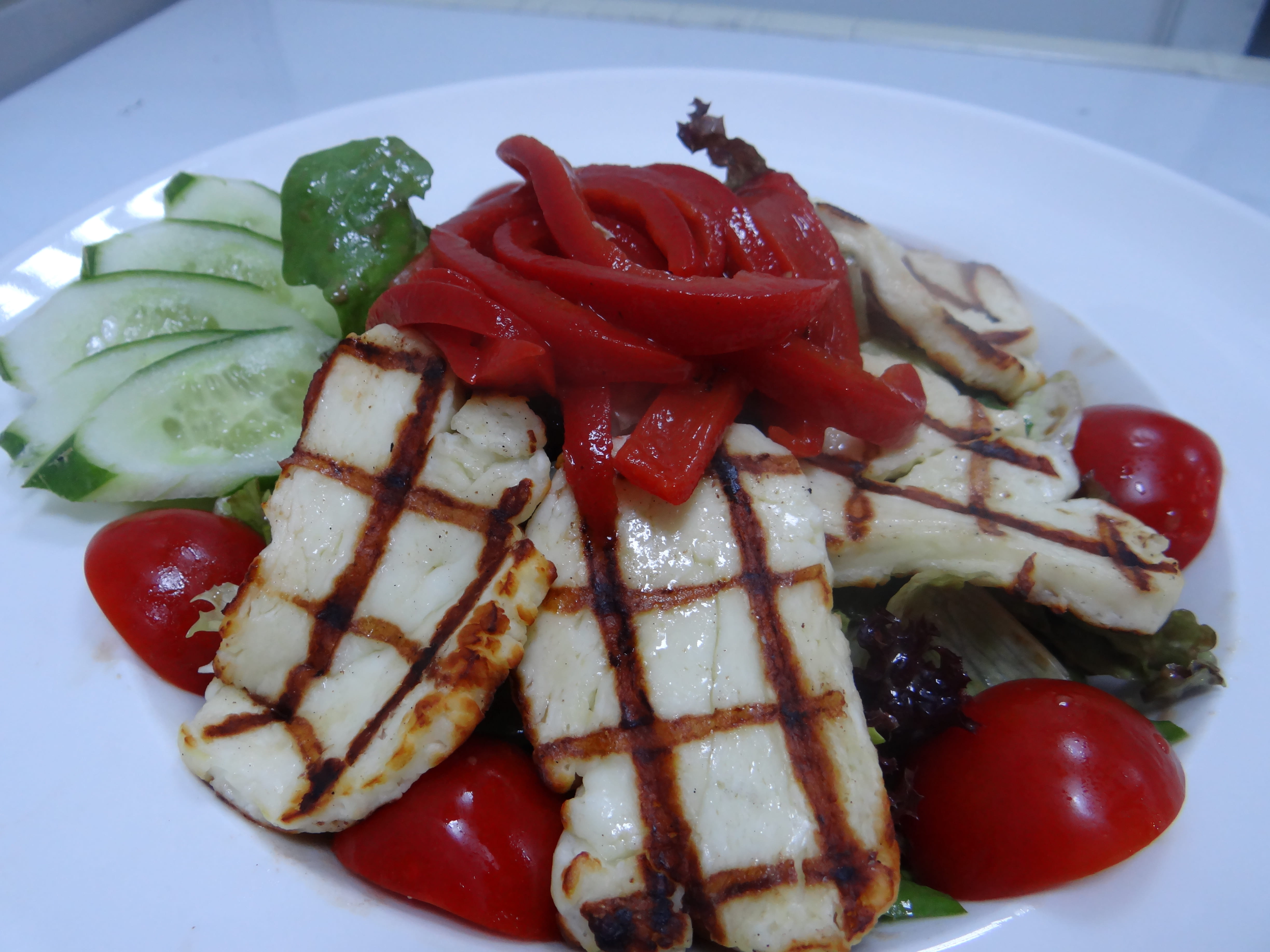 MALZEMELER: 125gr hellim peyniri 120gr akdeniz yeşillikleri 50gr kırmızı köz biber 50 gr ceri domates 50 gr ceri domates 20 gr yaban mersini 20 gr ceviz ici SOS MALZEMELERİ: 50gr dijon hardal 50 gr mayonez 10 gr taze kekik 1 tatlı kasıgı limon az degirmen kara biber SOS YAPILISI: bütün malzemelerimizi ovalbir kaba koyup iyice karıstırıyoruz tadına bakıyoruz YAPILIŞI: hellim peynirlerimizi dilimleyip yumusayana kadar ızgaramızda pişiriyoruz. akdeniz yeşilliklerimizi sirkeli suda 10 dk beklettikden sonra en az 2 kez olmak şartıyla temiz suyla yıkayıp havlu pecete yardımıyla nemini alıp kurutuyoruz.(kurutmakdaki amacımız sosumuzun yeşilliklerimize yapısıp esit sekilde dagılmasıdır. yeşilliklerimiz nemli olursa sosumuz akar) kapya biberimizi ızgarada közleyip kabugunu soyuyoruz ve uzun uzun dilimliyoruz. yesilliklerimizle sosumuzu cukur ve kuru bir kapda karıstırıp tabagımıza alıyoruz. üzerine hellimlerimizi dizip ceri domates ve salatalılarımızıda ekledikden sonra ceviz ici ve yaban mersinlerimizi serpiştiriyoruz. AFİYET OLSUN